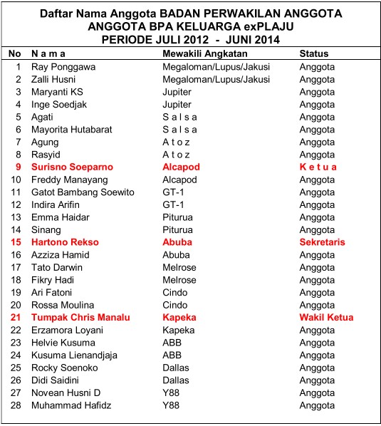 Pada hari Sabtu, tgl 14 Juli 2012 dalam rapat wakil-wakil angkatan dan pengurus Keluarga exPlaju telah terbentuk Badan Perwakilan Anggota (BPA) Keluarga exPlaju. Kemudian diadakan voting untuk memilih ketua, wakil ketua dan sekretaris BPA.